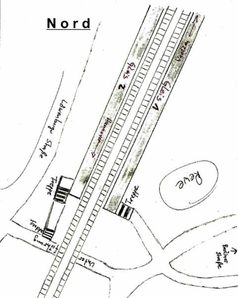 Der Weg führt an der Straßenkreuzung Am Stadtpark – Hirtenstraße – Berliner Straße - über die Rampe auf Gleis 1, von dort mit dem Aufzug hinunter auf die Straßenebene und dann mit dem daneben liegenden Aufzug auf Gleis 2. Somit wäre die 20 %ige Steigung der Straßenunterführung entschärft.