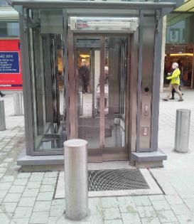 Auf der Straßenebene ist der Aufzug, der von zwei Seiten betreten werden kann, rundum mit Pollern abgesichert.