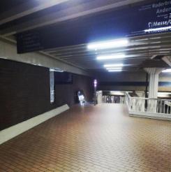 Er wird in der Ecke des Abgangs zum stadtauswärtigen Bahnsteig, etwa 1,40 m hinter der heutigen Wand zurückversetzt, ankommen. Die Breite des Zugangs beträgt 1,65 m. Aufzüge auf die Bahnsteige Diese sind Durchlader. Eine gerade Hineinfahrt an diesem Standort und eine gerade Hinausfahrt auf Bahnsteigebene ist möglich. Durch die Säulen im Zugangsbereich ergibt sich eine Einschränkung in der Bewegungsfreiheit. Der direkte Bereich vor den Aufzügen verringert sich auf 1,10 x 1,30 m. Der Bereich weitet sich allerdings noch auf, ist dann aber eine gemeinsame Nutzung mit den Fahrgästen die die direkt neben dem Aufzug liegenden Steintreppen und die gleich daneben liegenden Rolltreppen für den Auf- und Abgang benutzen. Die Aufzugsmaße: 1,10 m breit, 2,60 m lang. Damit sind die Mindestmaße von 1,10 x 1,40 m erfüllt.
